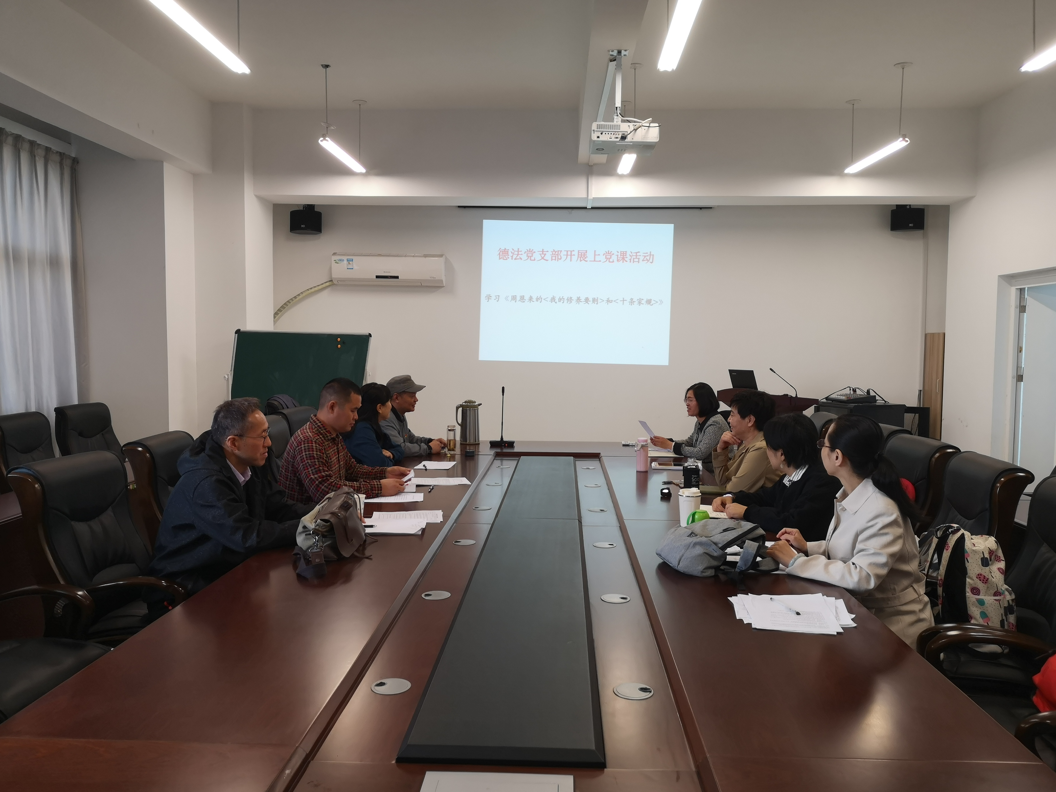 支部书记李咏梅首先给大家讲述了,1943年3月18日是周恩来45岁生日。当天晚上,他在办公室写下了著名的《我的修养要则》,对自己提出了七条严格要求:加紧学习,抓住中心,宁精勿杂,宁专勿多;努力工作,要有计划,有重点,有条理;习作合一,要注意时间、空间和条件,使之配合适当,要注意检讨和整理,要有发现和创造;要与自己的他人的一切不正确的思想意识作原则上坚决的斗争;适当的发扬自己的长处,具体的纠正自己的短处;永远不与群众隔离,向群众学习,并帮助他们过集体生活,注意调研,遵守纪律;健全自己身体,保持合理的规律生活,这是自我修养的物质基础。然后书记又给大家宣读周恩来的十条家规:晚辈不能丢下工作专程进京看望他,只能在出差路过时才可以去看看;外地亲属进京看望他,一律住国务院招待所,住宿费由他支付;一律到国务院机关食堂排队就餐,有工作的自付伙食费,没工作的由他代付;看戏以家属身份购票入场,不得享用招待券;不许请客送礼;不许动用公车;凡个人生活中自己能做的事,不要别人代劳,自我服务;生活要艰苦朴素;在任何场合都不能说出与他的关系,不要炫耀自己;不谋私利,不搞特殊化。最后大家进行讨论。