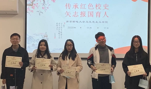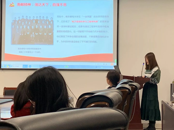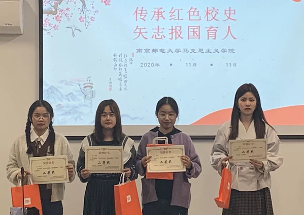 万文文、田宁、孙喆茜、涂曼四位同学的女生合唱《望柚子》博得现场的阵阵掌声。最后在贾天威同学趣味故事式的《南邮校史宣讲》中圆满结束。