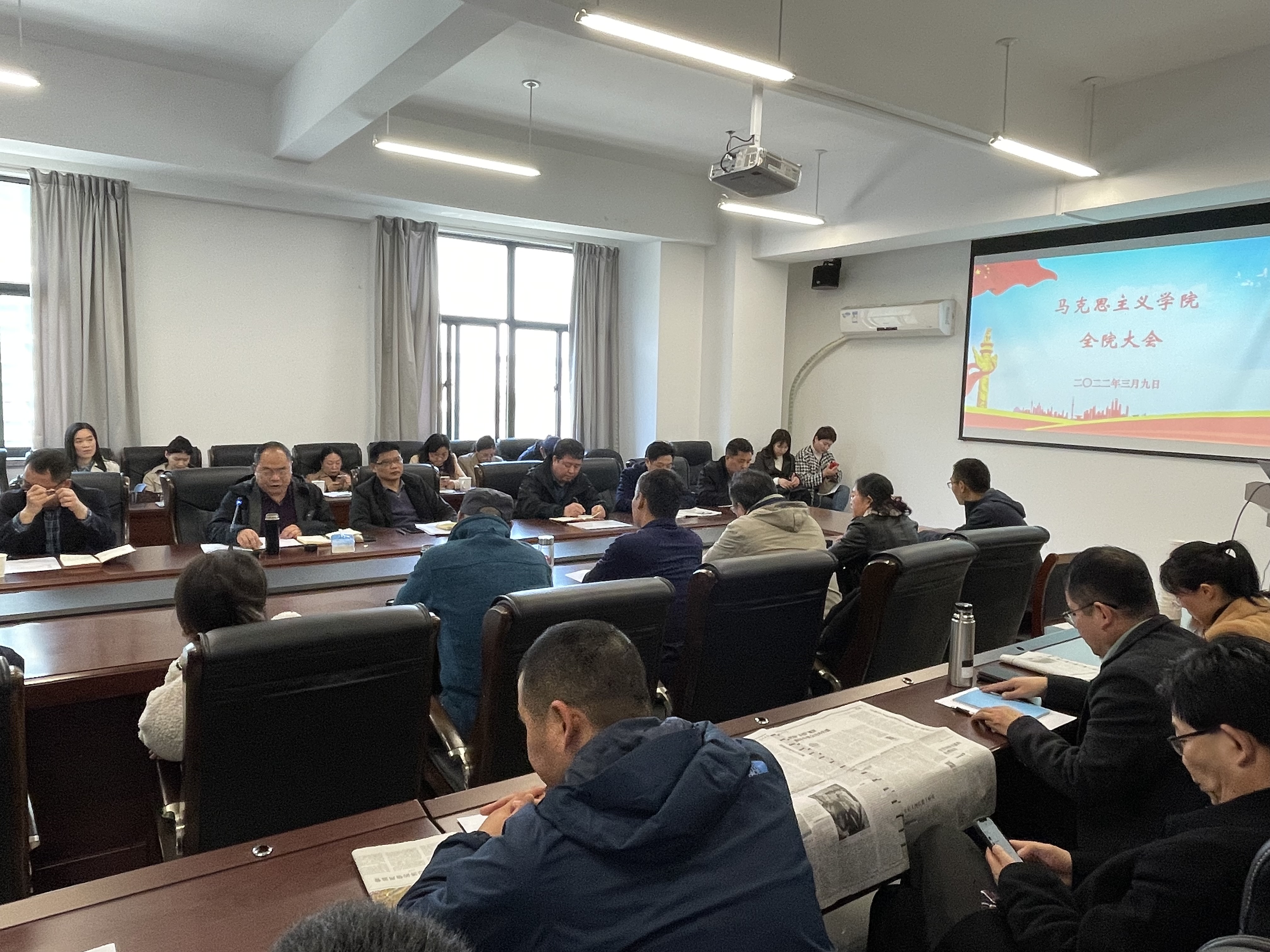 最后,沈召前书记作总结讲话。沈书记指出,2022年是具有重要意义的一年,党的二十大即将召开,学校也即将迎来八十周年校庆。我们要深刻认识“两个确立”的决定性意义,自觉增强“四个意识”、坚定“四个自信”、做到“两个维护”,弘扬伟大建党精神,以党建引领马院高质量发展。开学以来学院各项工作平稳运行,下面要着重做好以下几方面工作。一是做好政治巡察整改。全院要提高政治站位、强化政治担当,把巡察整改作为一项严肃的政治任务、政治责任,高度负责尽责、抓紧抓实抓好,确保巡察反馈意见真正落实落地;二是部署组织生活会和开展民主评议党员工作。根据学校要求,要做好组织生活会和开展民主评议党员工作,公司党政班子成员要以普通党员身份参加所在支部的组织生活会;三是部署全面从严治党专题会和意识形态专题会工作。学院将于近期召开全面从严治党专题会和意识形态专题会,并对全面从严治党及党风廉政建设工作、师德师风建设、意识形态工作等进行部署。沈书记最后强调,马院老师要落实好立德树人根本任务,真正把思政课上好,规范教学,严守师德师风底线,做到“在马言马,在马信马,在马爱马”。全院教职工要有高度的使命感和忧患意识,提振精气神,严格要求自己,全力冲刺学院马理论学科博士点申报。
