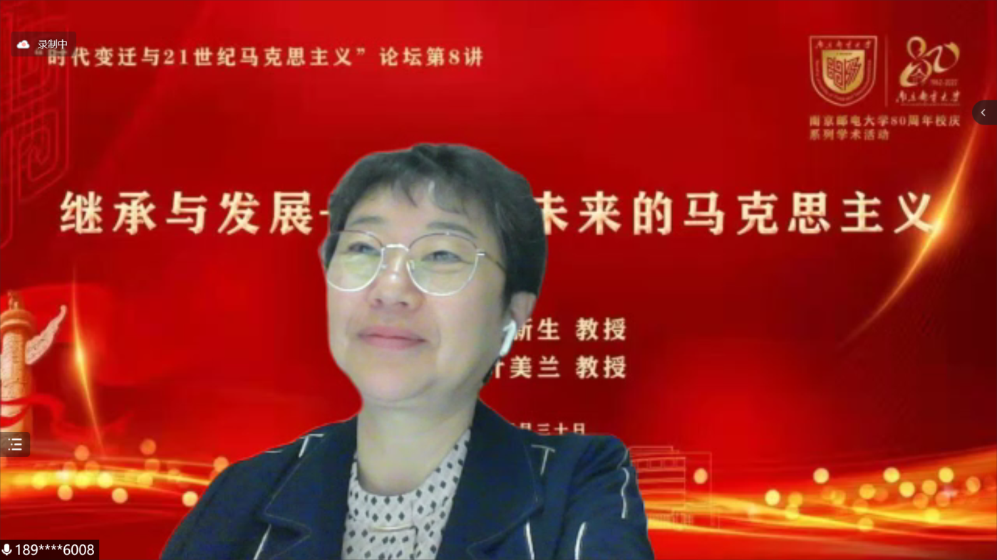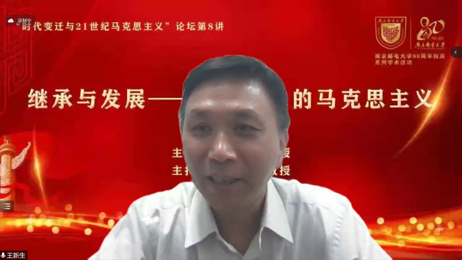 叶美兰董事长代表论坛主办方向与会代表表示了热烈的欢迎,介绍了主讲人的主要学术贡献,对王新生教授莅临“时代变迁与21世纪马克思主义”论坛表达了诚挚的感谢。叶董事长高度评价了王新生教授所作报告的学术价值与实践意义,认为王教授的报告全面阐述了新时代如何继承和发展马克思主义的问题,深刻思考了我们怎样传承和发展21世纪马克思主义的问题,内容丰富、语言生动、逻辑严密、系统深入,对于我们进一步深入研究、学习贯彻习近平新时代中国特色社会主义思想和党的十九届六中全会精神,具有重要的指导和推动作用。同时,叶董事长也对王新生教授能够在疫情好转之后来南邮指导工作表示了诚挚邀请。