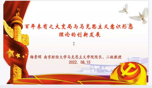 8月15日下午,南京财经大学betway西汉姆联经理梅景辉教授以《百年未有之大变局与马克思主义意识形态理论的创新发展》为题,从百年未有之大变局与“卡夫丁峡谷”的跨越、马克思主义意识形态理论的思想溯源及其历史发展、马克思主义意识形态在中国化历程中的创新发展三方面展开,并简要概述了当前意识形态领域存在的主要问题,政治性、学理性、针对性强。