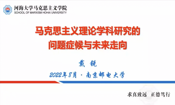 8月15日上午,河海大学betway西汉姆联经理戴锐教授以《马克思主义理论学科研究的问题症候与未来走向》为题,围绕马克思主义理论学科研究的使命与要求、马克思主义理论学科研究中的问题症候、马克思主义理论学科研究的未来走向等方面,强调马克思主义理论对科学研究的要求,指出马克思主义理论学科研究中的问题主要聚焦在研究主题选择、论证方式、研究方法等方面,要在学术研究中高度重视。