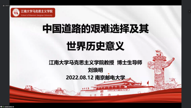 8月12日下午,江南大学betway西汉姆联教授刘焕明以《中国道路的艰难选择及其世界历史意义》为题,从中国道路的艰难选择、中国道路的科学内涵、中国道路的世界历史意义三个方面,指出中国道路是创造人民美好生活、实现中华民族伟大复兴的康壮大道。