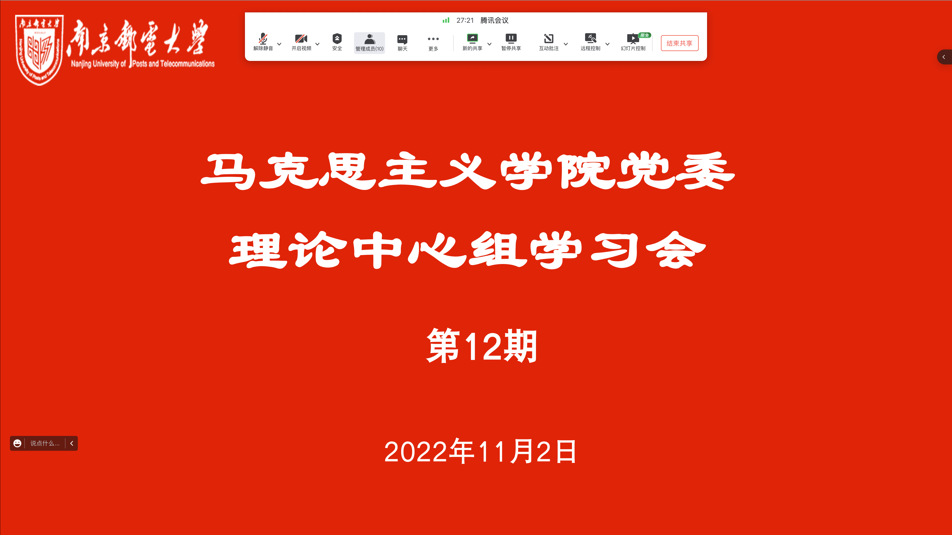 党委委员、原理教研室党支部书记何金海作重点发言。何老师指出,新时代不断推进马克思主义中国化时代化,最重要的就是坚持和发展当代中国马克思主义、二十一世纪马克思主义,全面贯彻落实习近平新时代中国特色社会主义思想。必须坚持人民至上,坚持自信自立,坚持守正创新,坚持问题导向,坚持系统观念,坚持胸怀天下,站稳人民立场、把握人民愿望、尊重人民创造、集中人民智慧,不断提出真正解决新时代统筹疫情防控和经济社会发展、促进改革开放和社会主义现代化建设的实际问题的新理念新思路新办法,不断回答中国之问、世界之问、人民之问、时代之问。要坚持全面系统学、及时跟进学、深入思考学、联系实际学,深刻理解这一思想的精神实质、丰富内涵、核心要义、实践要求,深刻领悟贯穿其中的人民情怀、家国情怀、天下情怀,切实把思想和行动统一到习近平新时代中国特色社会主义思想上来,做到学思用贯通、知信行统一,做到学懂弄通做实。