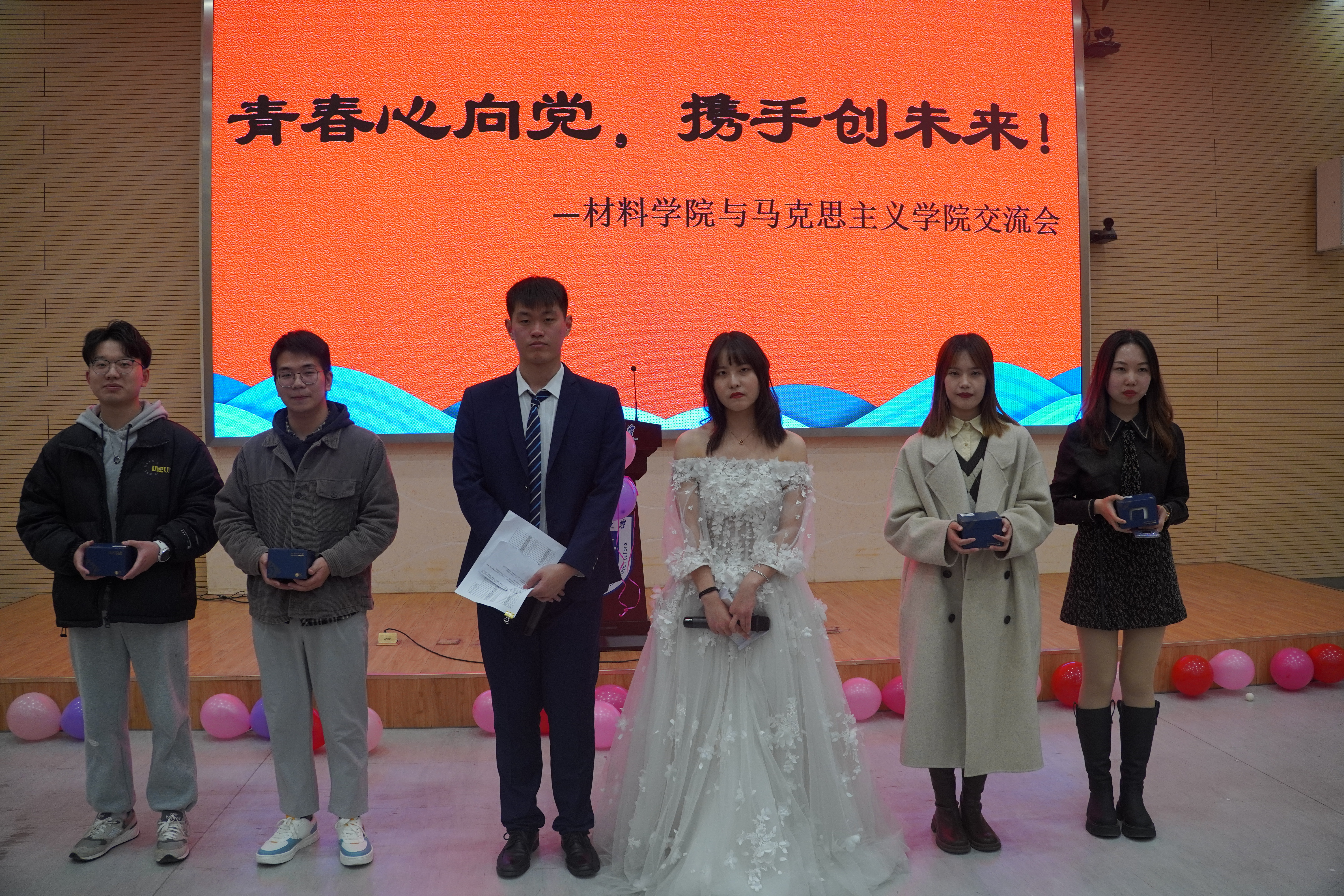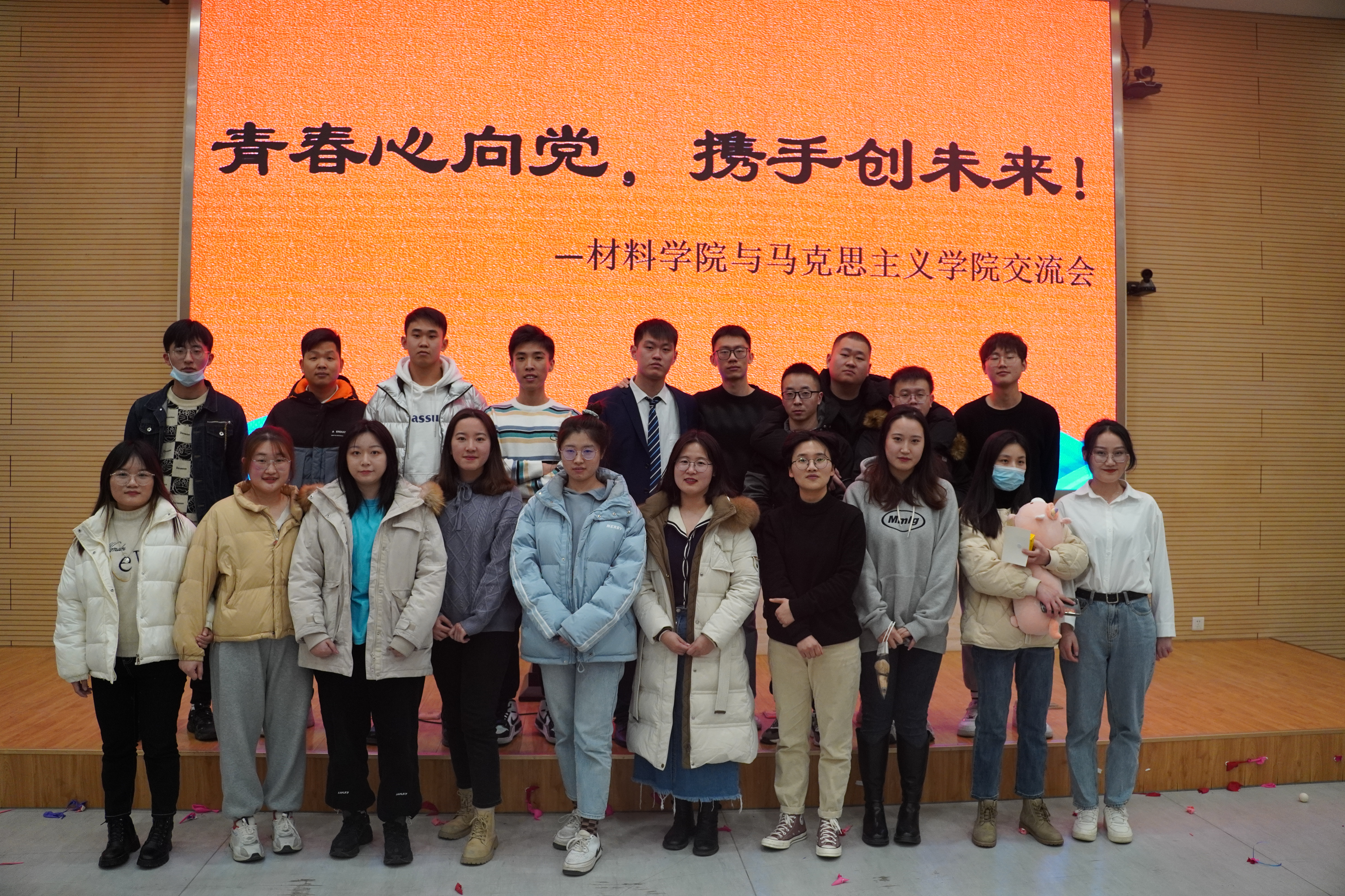 为开阔研究生同学的视野,激发研究生同学的科研热情,加强跨学科交流沟通,展现当代研究生良好的精神面貌,betway西汉姆联与材料学院于2021年12月30日晚联合举办了“青春心向党,携手创未来”交流会活动。活动分为三个环节,分别为表演环节,抽奖环节和游戏环节。