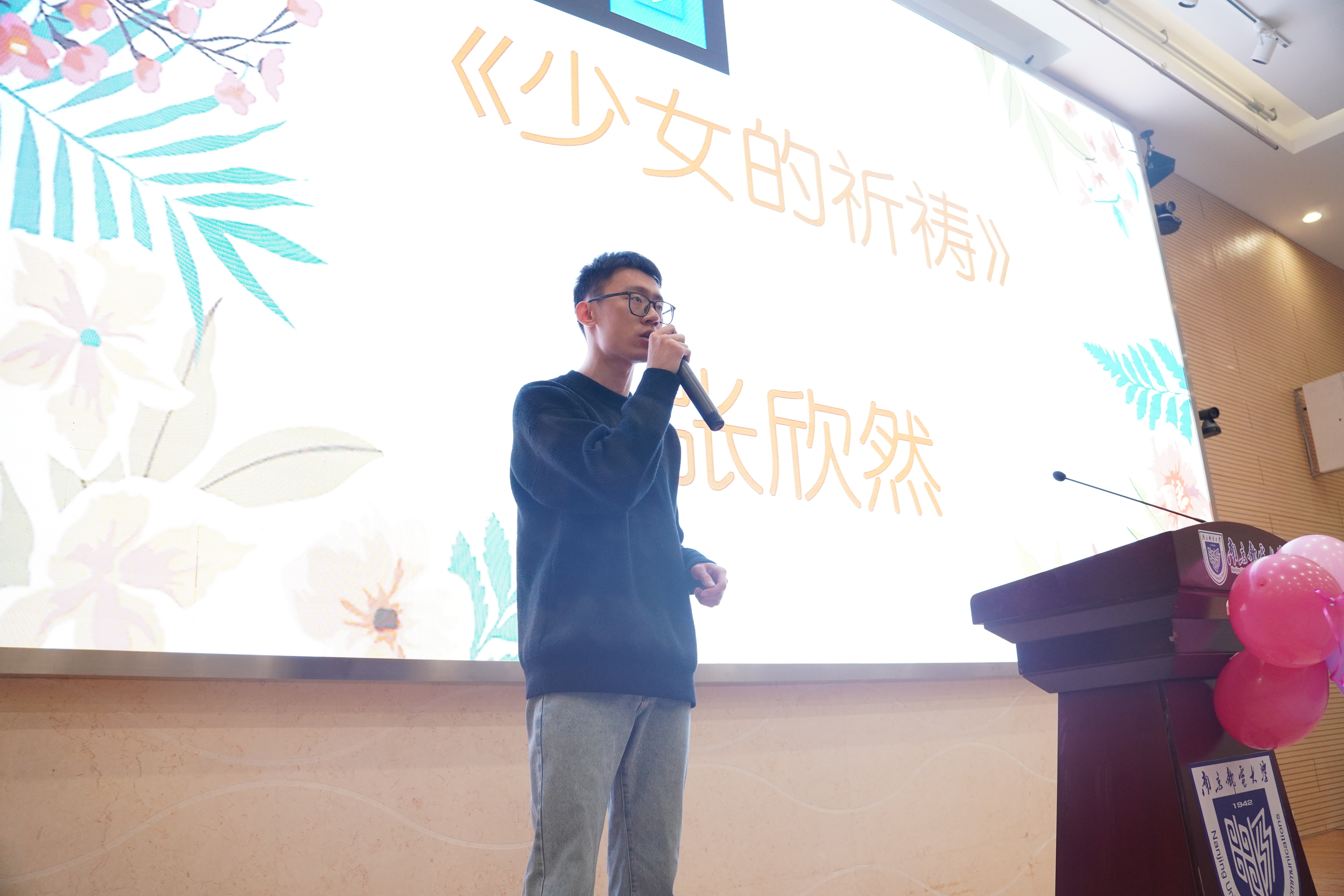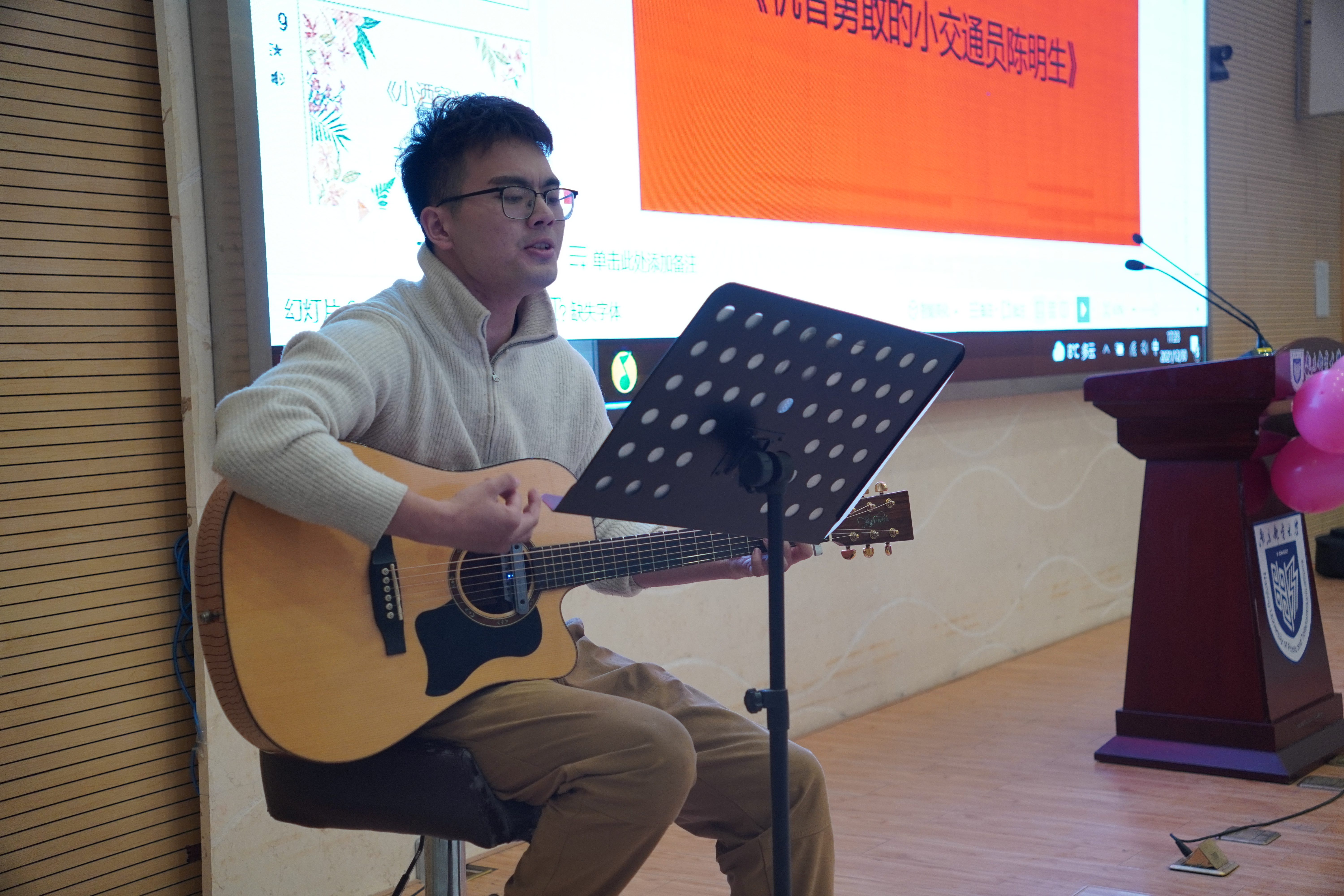 材料学院于海鹏、唐瑾(女)两位同学为我们演唱了歌曲《告白气球》,为活动进行了暖场。betway西汉姆联卫明皓同学为我们弹唱了歌曲《春夏秋冬的你》,歌声令现场的观众陶醉其中。