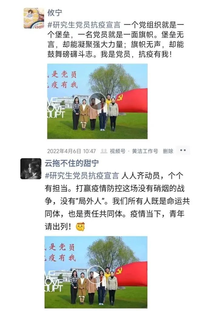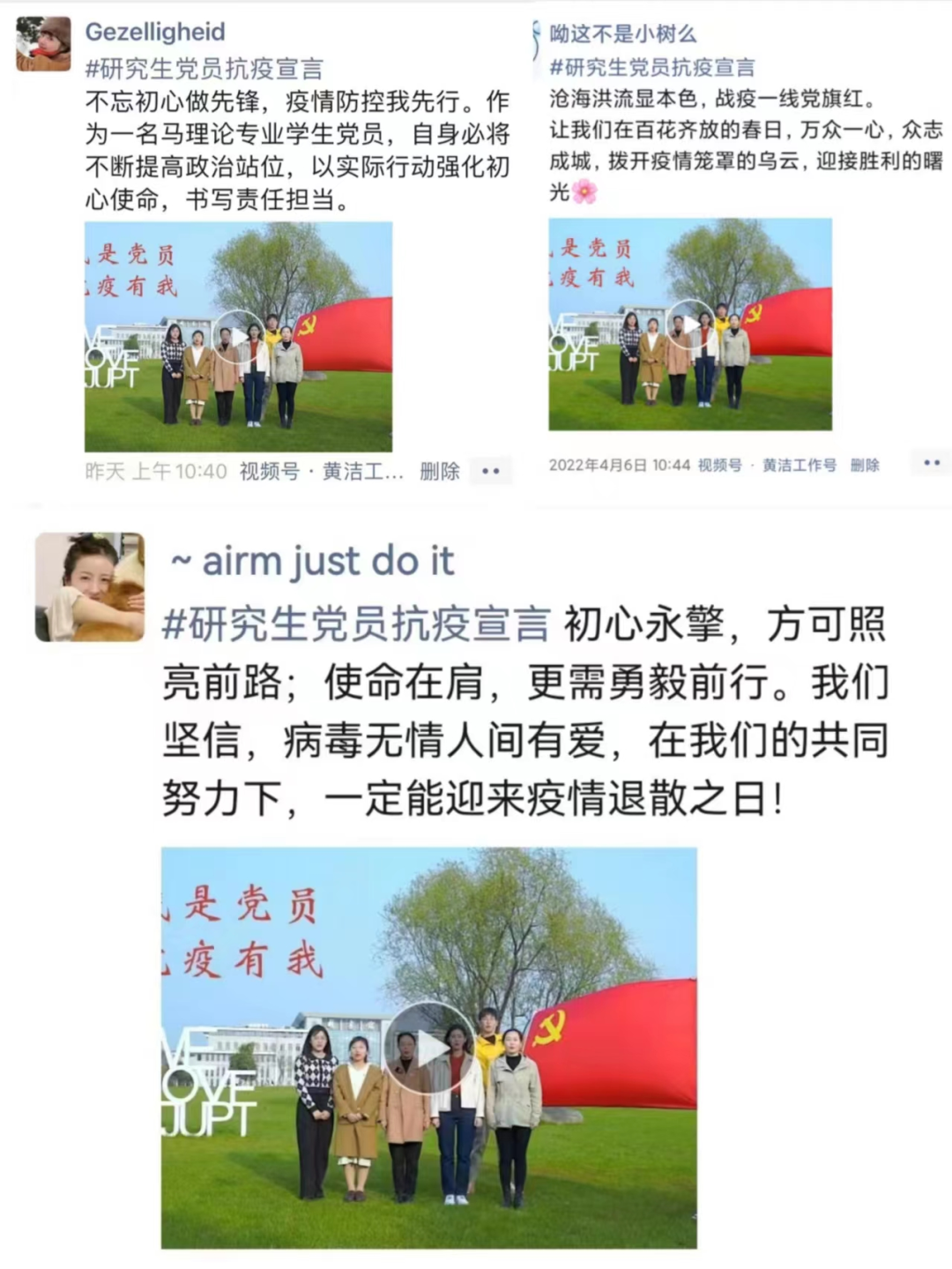 在党日活动中,党支部通过策划文案、拍摄转发抗疫视频、发表抗疫宣言为主要形式,组织支部全体研究生党员及入党积极分子积极参与活动,在“亮身份、做表率”的过程中彰显betway西汉姆联员工党员的时代担当,以实际行动,为新冠疫情防控工作作出自己力所能及的贡献。全体党员高涨的热情,广泛地参与积极响应,在活动中一句句“我是党员,抗疫有我!”“一名党员,一面旗帜!”“沧海横流显本色,战疫一线党旗红”展现了党员们坚定的态度、乐观的心态和必将取得胜利的决心。