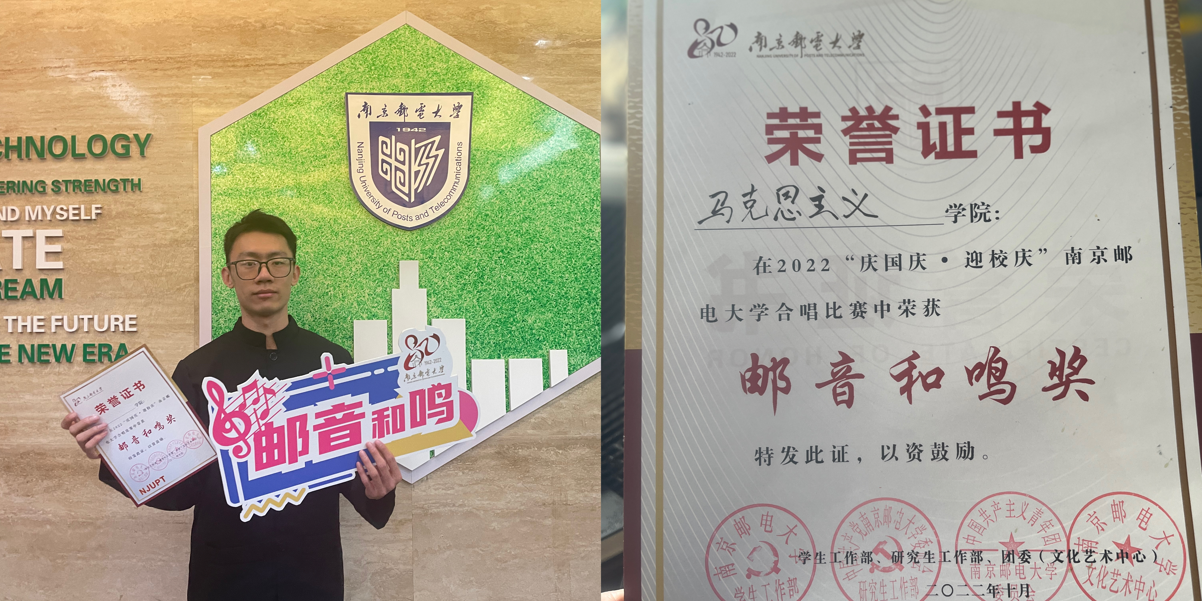 为喜迎二十大的召开,庆祝祖国成立73周年,迎接南邮80周年华诞,学校组织的“庆国庆·迎校庆”大合唱比赛,全校共有21个学院参与比赛,作为唯一的一支研究生参赛队伍,马院研究生最终以一曲《我和我的祖国》荣获了“邮音和鸣”奖。