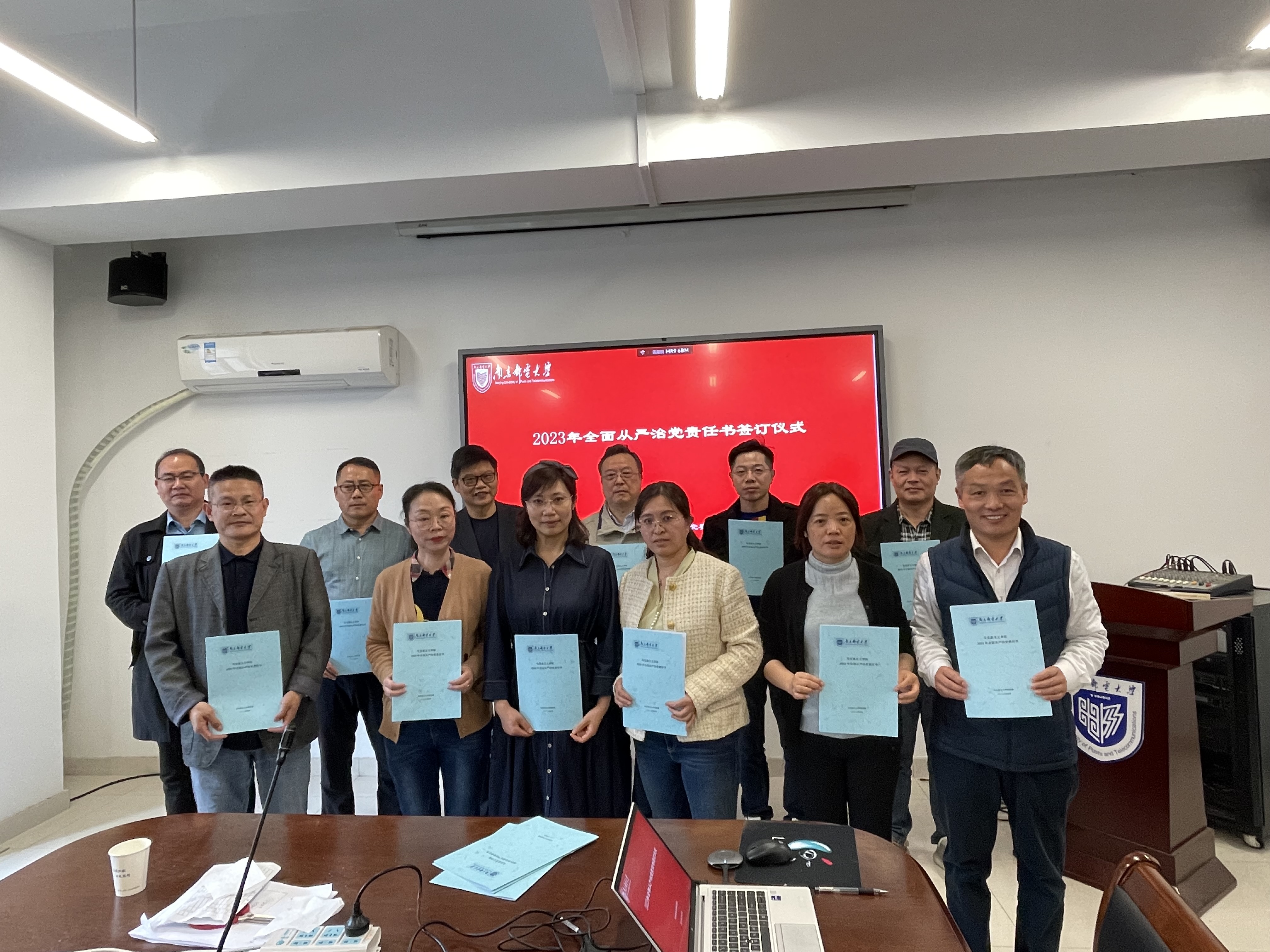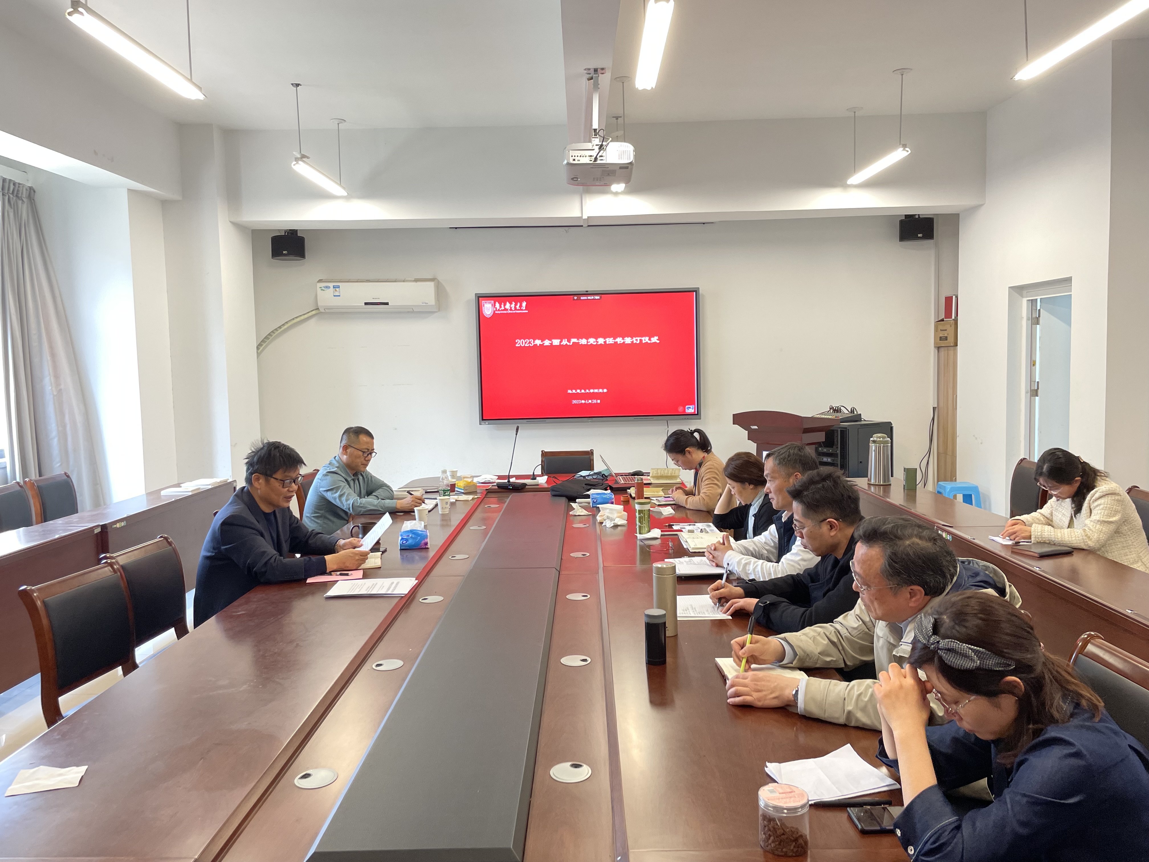4月26日下午,马克思主义公司党委在文科楼330会议室举行2023年全面从严治党责任书签订仪式。院领导班子成员、支部书记、教学机构负责人、经理助理等参加会议。公司党委书记沈召前主持会议。
