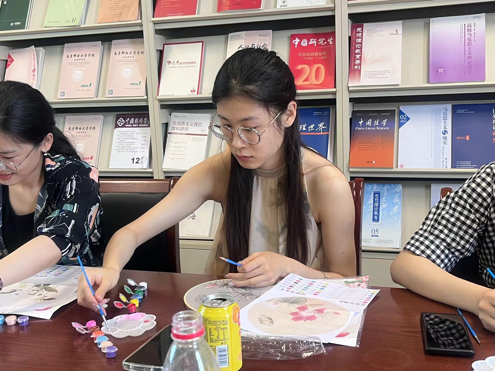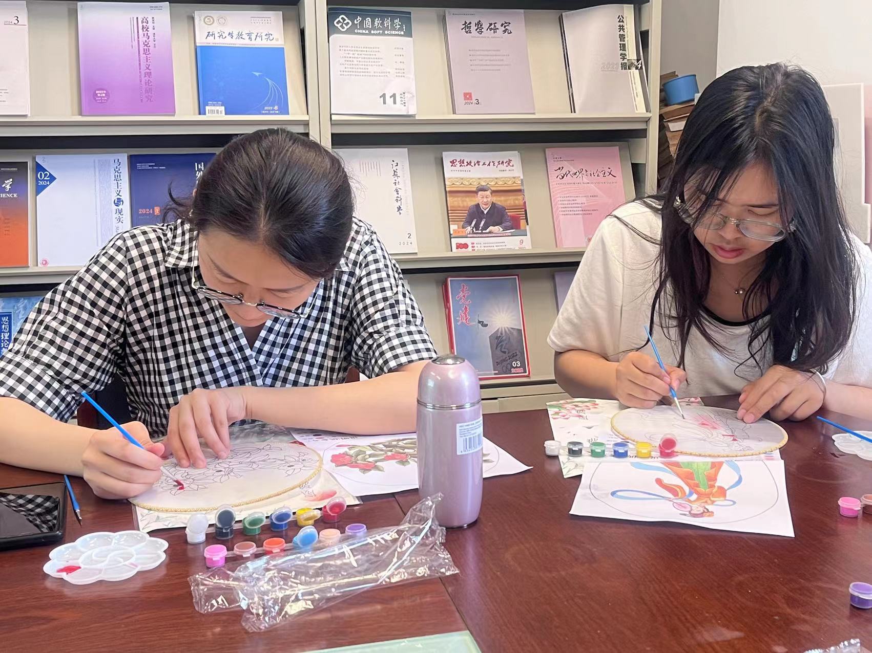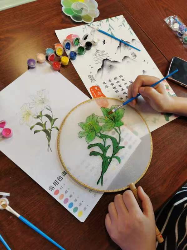 活动中,每人手上都拿到了一把空白的扇面,几根画笔,一个调色盘和各色颜料,大家拿到扇面后精心设计扇面色彩结构,细致耐心勾勒线条,在制作中师生相互交流学习,分享生活感受,现场氛围温馨而融洽。