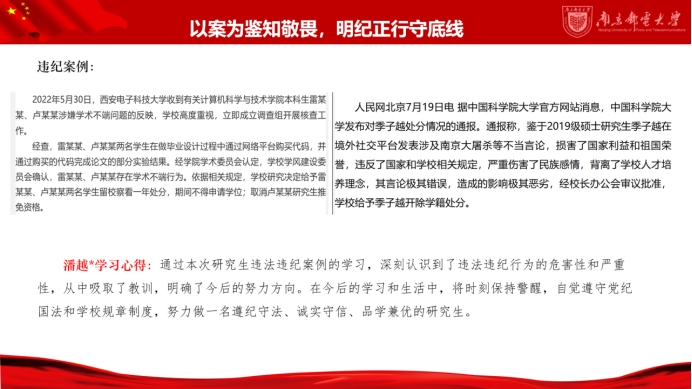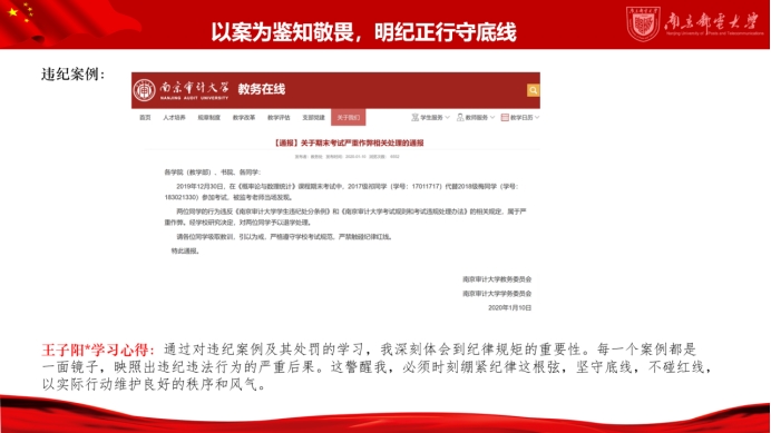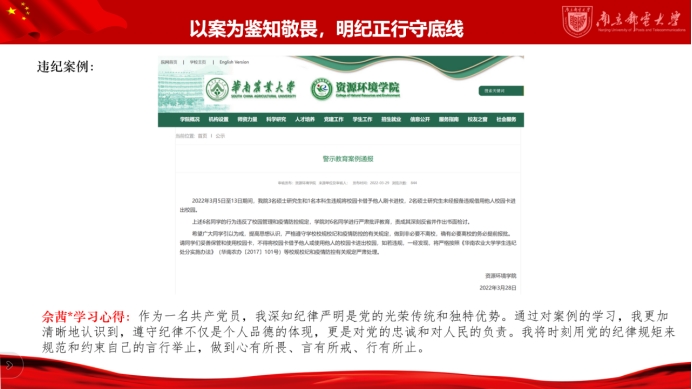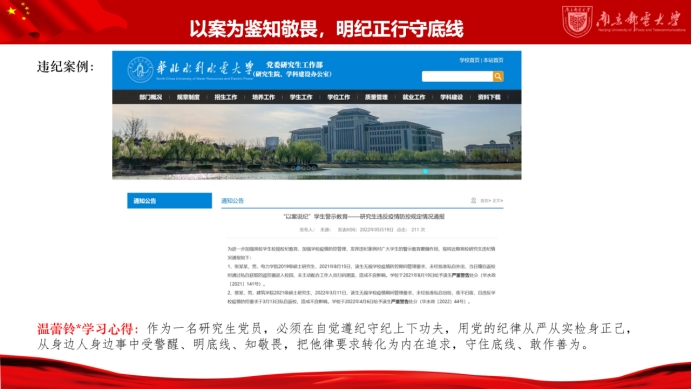 本次专题教育以典型违纪违法案件为鉴,要求支部全体党员紧紧抓住贯彻落实《中国共产党纪律处分条例》的关键点,自行选取一则或多则违纪违规案例,并线上分享学习心得。支部党员逐一进行分享,在收集案例、学习案例、分析案例的过程中全体党员深刻领悟到自觉遵守党纪的重要性,认识到加强纪律意识、不断加固思想道德防线的必要性,自觉将纪律观念内化于心、外化于行。此次专题学习不仅仅是一次知识的学习,更是一次心灵的洗礼。