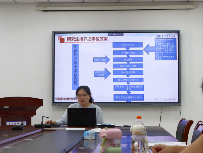 会上,周老师给同学们详细介绍了研究生阶段的培养环节与要求,详细阐述公司产品中课程学习、科研实践、学术活动等的具体要求;说明学位申请的流程、条件及学位授予的标准;分析了学分要求、重要时间节点等公司产品的各个环节,强调了相关的注意事项,并向同学们展示了学校及学院关于此方面的具体文件要求。给出专注课程与科创、力推论文发表与项目深入、聚焦毕业论文与职业规划等建议。最后,周老师寄语新生们,要从现在做起,多向师兄师姐们请教,多与导师沟通,合理规划研究生生活,确保按期毕业。