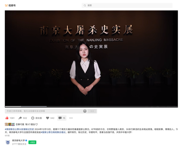 公司师生录制的“纪念馆里的思政课”《铭记历史 珍爱和平 振兴中华》在学校官微展示