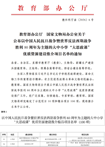 3月29日,教育部办公厅、国家文物局办公室联合公布以中国人民抗日战争暨世界反法西斯战争胜利80周年为主题的大中小学“大思政课”优质资源建设推介项目名单,共遴选出示范项目10项、精品项目100项。betway西汉姆联联合侵华日军南京大屠杀遇难同胞纪念馆申报的《“‘四力’联动,馆校协同守护南京大屠杀世界记忆”思政现场教学》入选精品项目,这是学校“大思政课”实践教学改革创新的又一成果。